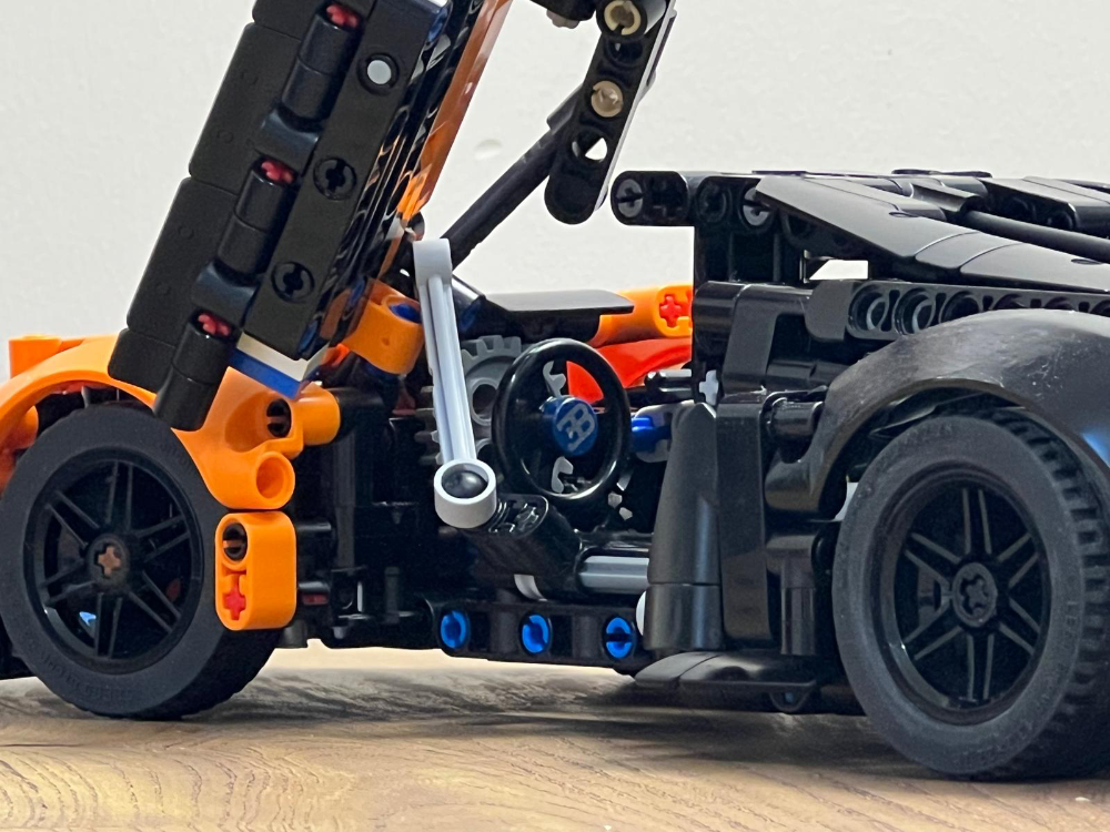 Due to space savings constraints, the fake engine is fitted 1 stud lower and 3 studs back compared to the axles that connect to the wheels. That to save space not only length wise but also height wise to fit the spoiler linkage. Unfortunately there isn't space for a differential so it only is driven by a "fixed" axle, does not add too many problems though because of the small turning of the front wheels.